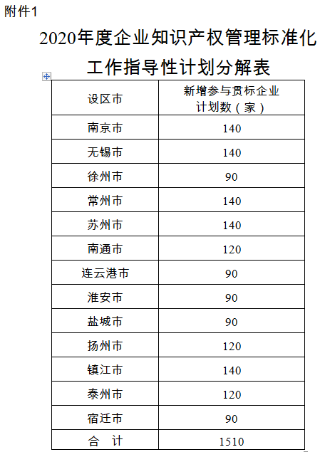 2020年,全省计划新增参与贯标企业1510家以上,各设区市新增参与贯标企业数见指导性计划分解表(附件1)。